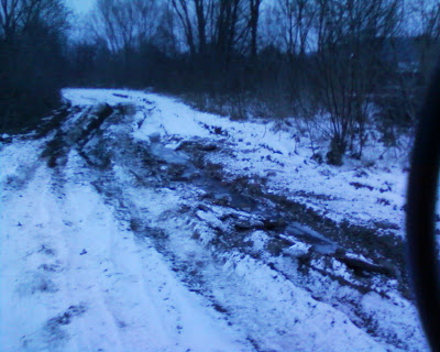 A főút helyett a terepet választottam, mert a 31-es főút maga az életveszély, ráadásul szétesett a piros lámpám és elfelejtettem láthatósági mellényt vinni. A földút viszont az évszaknak és a traktoroknak-terepjáróknak köszönhetően merő egy vájat, gödör, befagyott tócsa, porhó, letaposott hó, jég, fagyott föld és jégszilánkok bájos elegye, ráadásul dombos. És szép komótosan, de sötétedett.